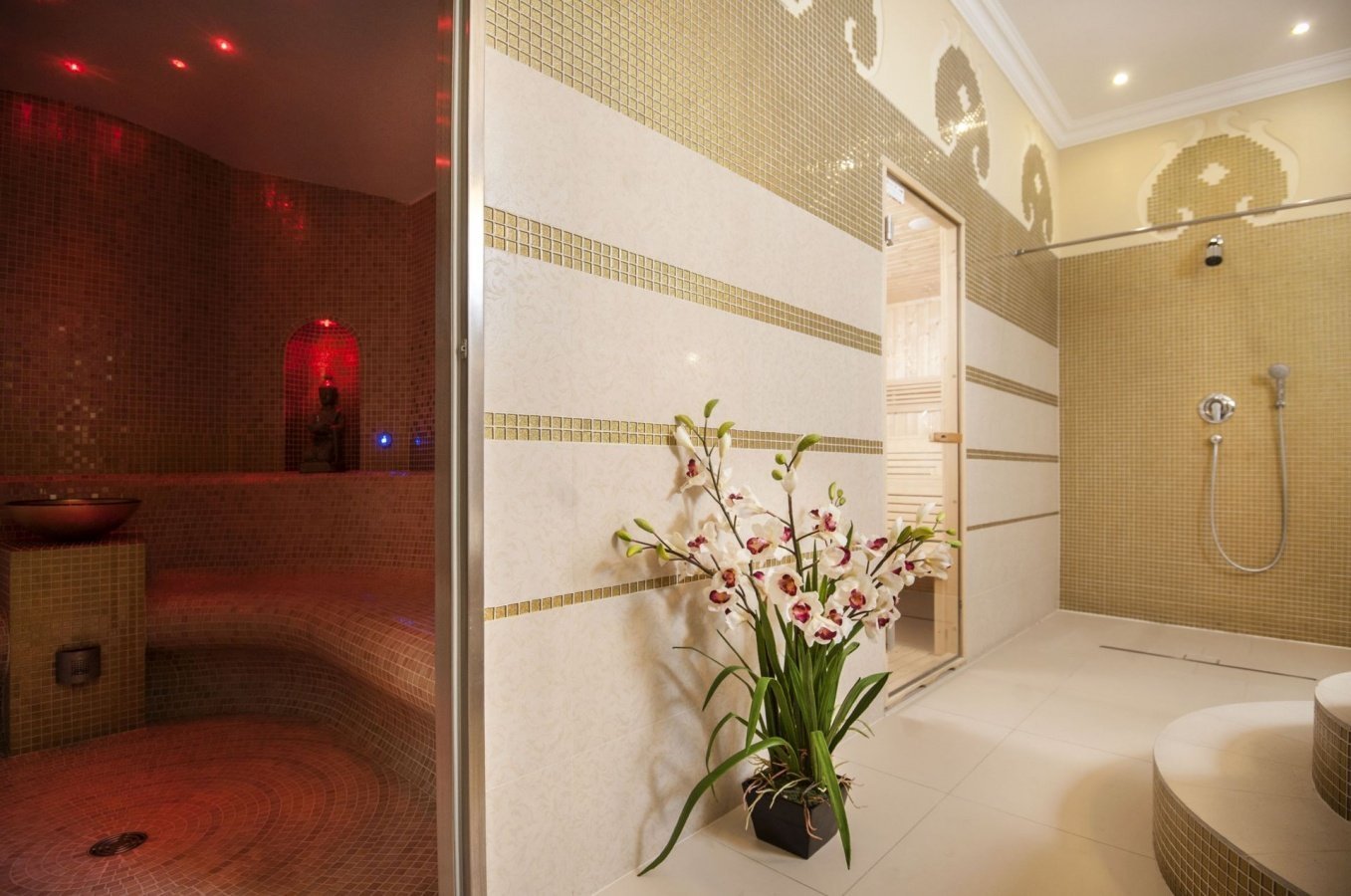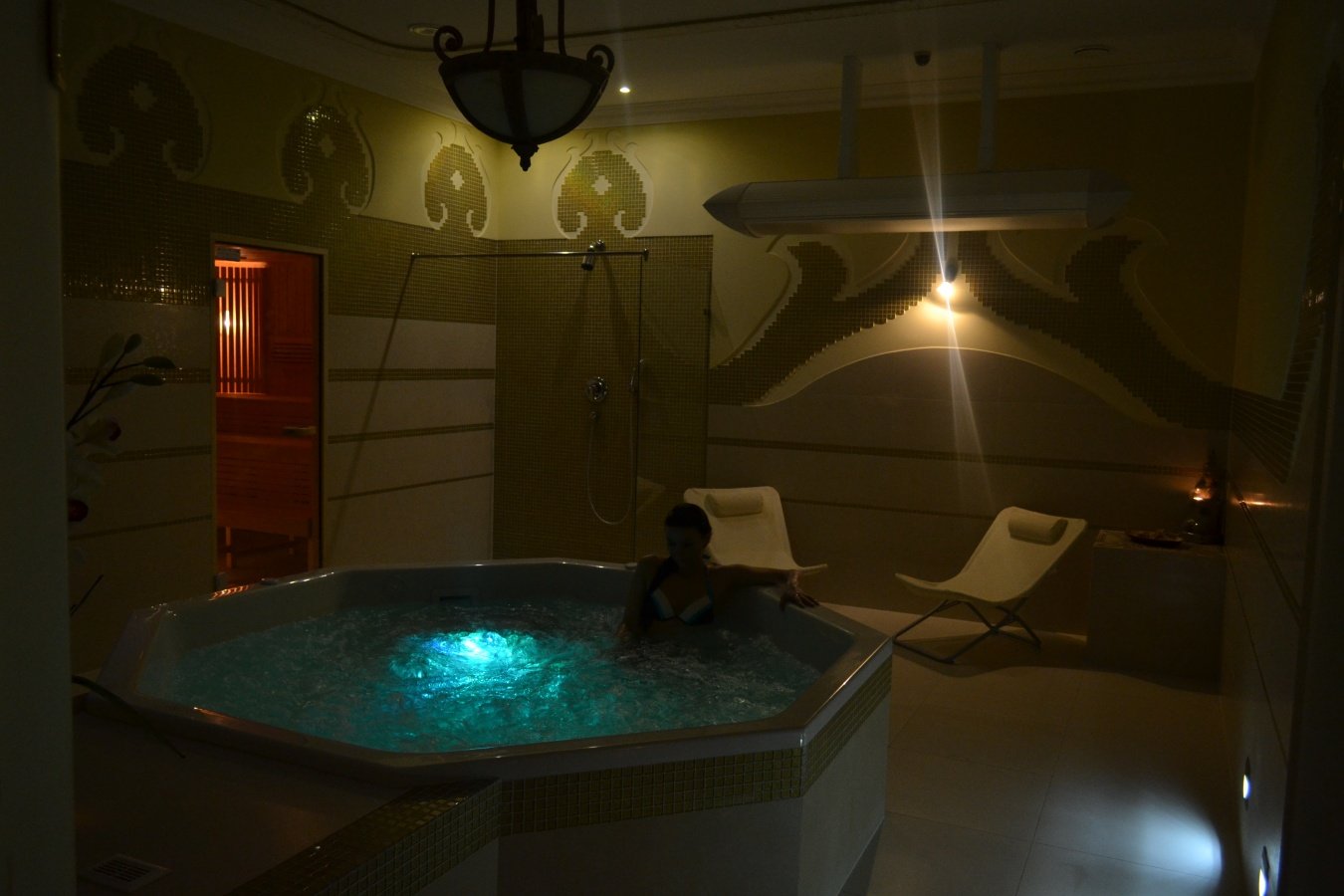 Jacuzzi - 10-15-minutowa kąpiel w ciepłej (ok. 35 stopni Celsjusza) wodzie z bąbelkami znakomicie niweluje stres i relaksuje, ale również pozytywnie wpływa na krążenie krwi, rozluźnia mięśnie, wygrzewa stawy, poprawia stan skóry i przyspiesza przemianę materii. Zaleca się ją osobom zmęczonym, zestresowanym, z obniżonym ciśnieniem krwi, bólami pourazowymi, bólami kręgosłupa, mięśni i stawów, niektórymi problemami skóry, cellulitem, nadwagą i problemami metabolicznymi. Grota solna - 45 minutowy pobyt w grocie solnej dla zdrowia znaczy tyle, co trzy dni urlopu nad morzem. W grocie solnej panuje specyficzny mikroklimat cechujący się wyjątkową czystością bakteriologiczną, a powietrze nasycone jest minerałami i mikroelementami takimi jak: jod, wapń, magnez, potas, sód i chlorki, żelazo, miedź, brom i selen, które występują w kilkakrotnie wyższym stężeniu niż nad morzem. Przez uzupełnianie w organizmie braku tych pierwiastków poprawie ulega kondycja zdrowotna. Komora solna wspomaga ciało w leczeniu różnych chorób, m.in. schorzeń górnych dróg oddechowych, astmy oskrzelowej, alergii, łuszczycy, stanów zapalnych skóry oraz schorzeń przewodu pokarmowego.